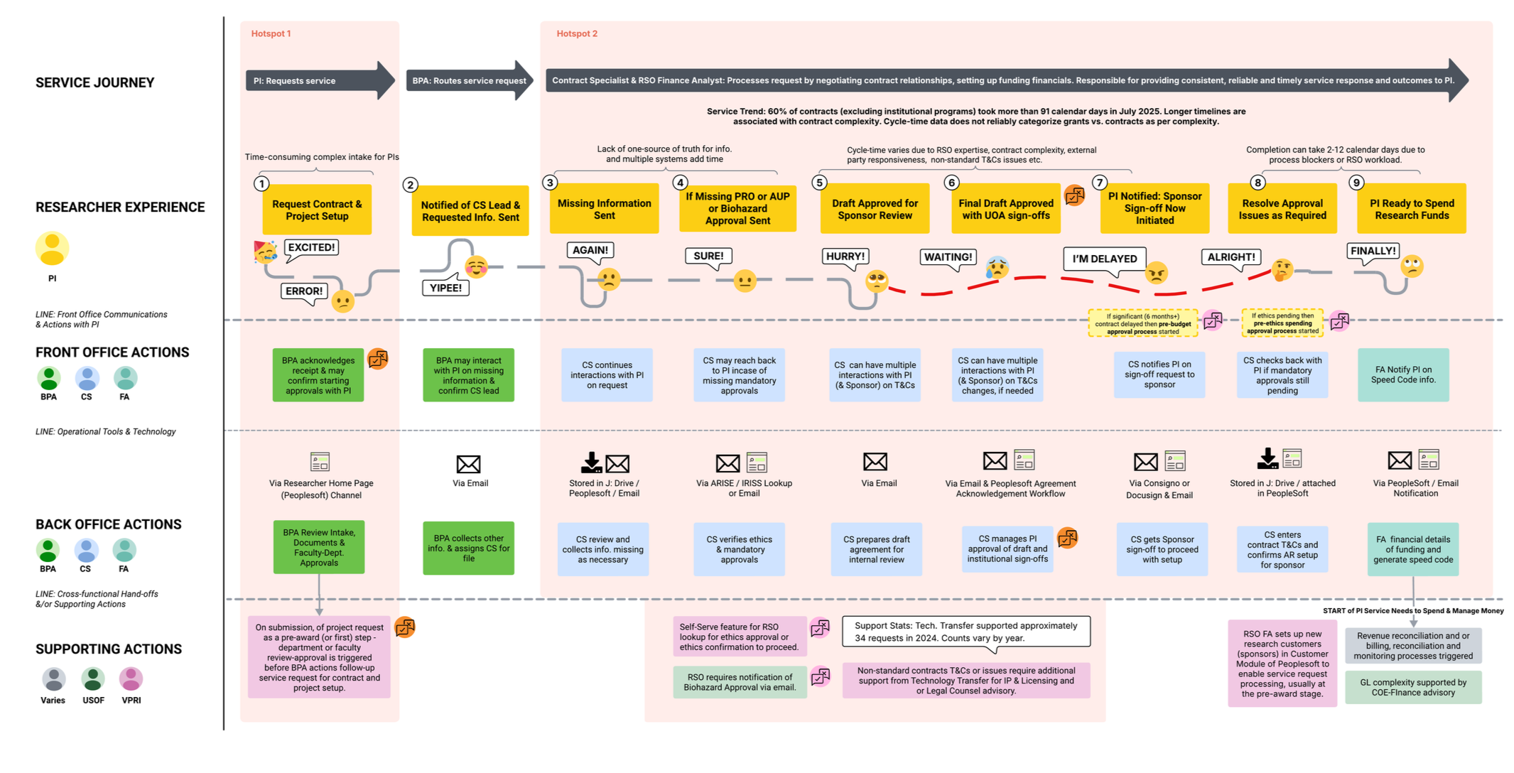 As a UX Research & Service Design Specialist, I applied human-centered design methodologies to improve complex research administration services. My work focused on creating impactful service design artifacts, including a service portal prototype for the ongoing development of the business case for digital transformation.